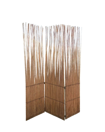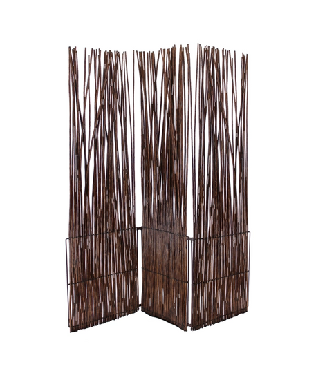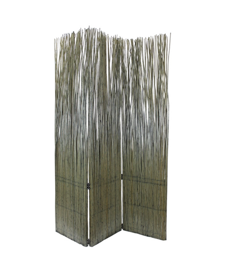 Screen Gems Juniper SG-348. This beautiful room divider features a tri-fold design with a trio of white willow panels held in place by metal hinges. Perfect for separating rooms, hiding clutter or filling any large space. Adds a touch of light to any room. Finished on both sides.